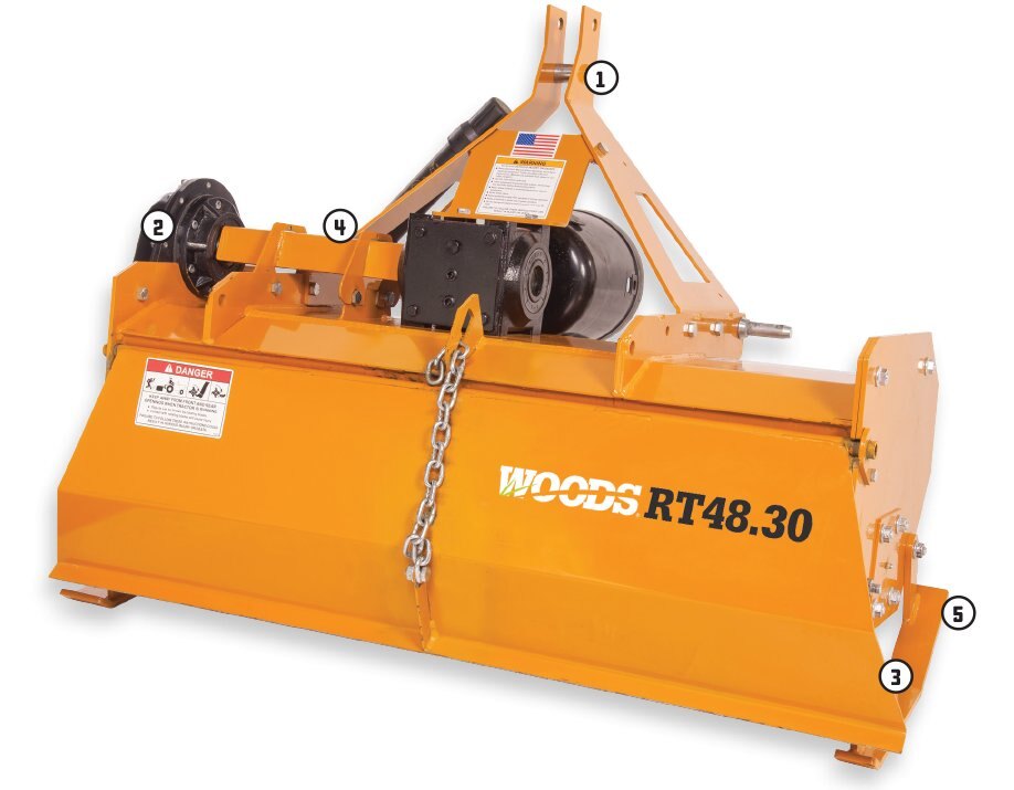 Ideal for compact tractors, Woods® line of rotary tillers deliver a finely finished seed bed in fewer passes. Woods tillers are offered in forward and reverse rotation. Every model features a durable, gear-driven side drive to tackle even tough soil conditions and is engineered Quick-Hitch Ready for easy tractor connection. The 6-year gearbox warranty includes parts, labor, and seals for the full warranty period.